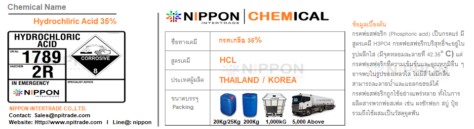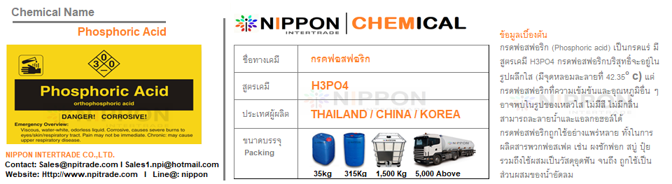 กรดฟอสฟอริค 85% มีลักษณะทางกายภาพเป็นของเหลว ใส ไม่มีสี ไม่มีกลิ่น มีความเป็นกรดแก่ และมีความหนืดเล็กน้อย นิยมใช้งานหลากหลายอุตสาหกรรม ทั้งอุตสาหกรรมการผลิตน้ำอัดลม การทำปุ๋ย ผงซักฟอก ตลอดจนงานอุตสาหกรรมเกี่ยวกับโลหะ ตัวสารเคมีมีความสามารถในการลดค่า pH และสามารถนำไปใช้งานในด้านการกำจัดตะกรัน