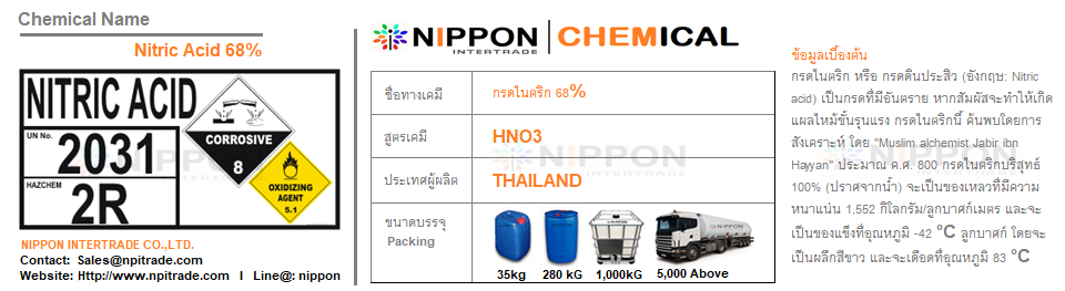 กรดไนตริก 68%  หรือกรดดินประสิวลักษณะทางกายภาพ เป็นของเหลว ใส ไม่มีสี หรือมีสีออกเหลือง มีกลิ่นเฉพาะ นิยมใช้ในการปรับค่า pH ในงานไฮโดรโพนิกส์ การสกัดทองและล้างทำความสะอาดผิวโลหะ งานอะโนไดส์ มีขนาดความเข้มข้นแตกต่างกัน