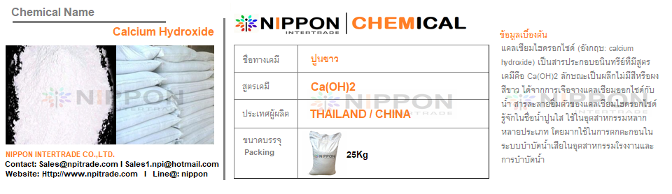ปูนขาว เป็นสารประกอบอนินทรีย์ มีลักษณะทางกายภาพเป็นผลึก ไม่มีสี หรือผงสีขาว รู้จักในชื่อน้ำปูนใส (Hydrated Lime)