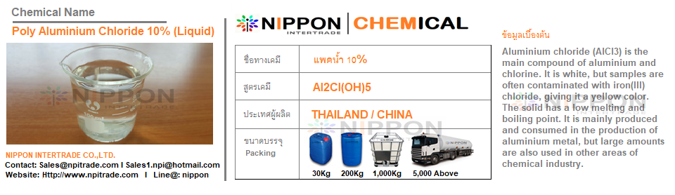 คลอรีนน้ำ 10% เป็นของเหลว ใส มีสีเหลืองอ่อน มีกลิ่นคลอรีน นิยมใช้ในการฆ่าเชื้อโรค เชื้อรา หากเป็นอุตสาหกรรมจะนิยมใช้ในการบำบัดน้ำเสีย ปรับค่า pH